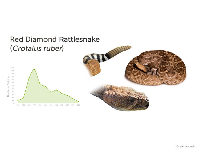 On the menu? All manner of small mammals, from rabbits and squirrels to gophers, mice, and rats. Rattlesnakes also eat birds, lizards, and other snakes. Warmer temperatures in spring mean they are willing to venture farther from their cozy dens in search of prey.